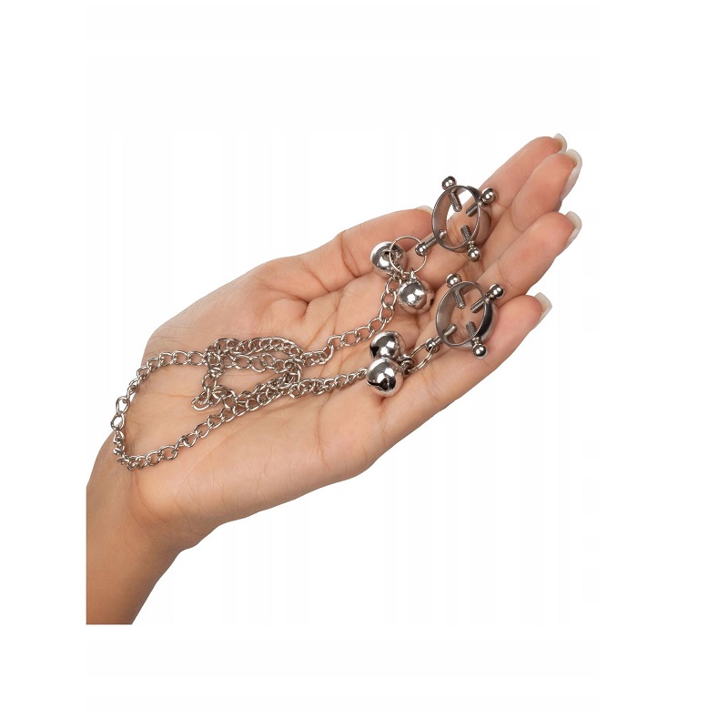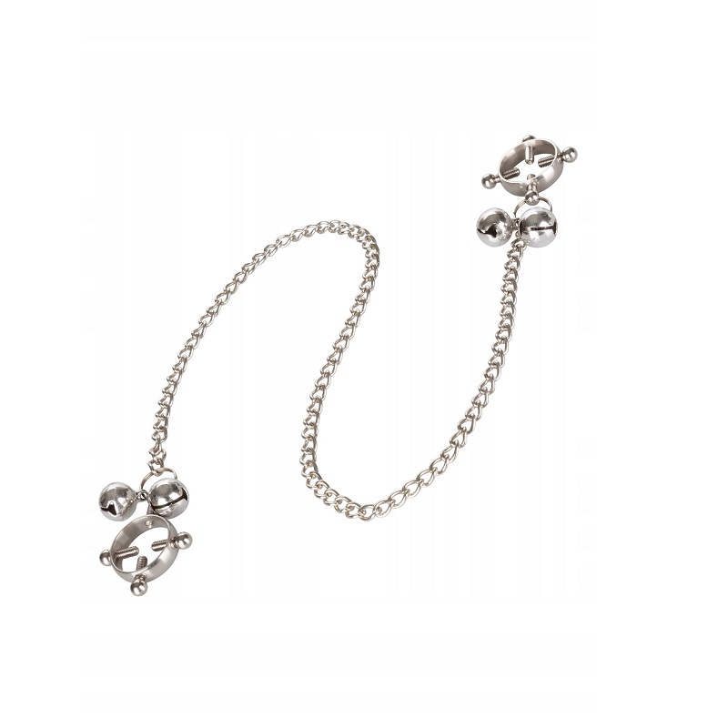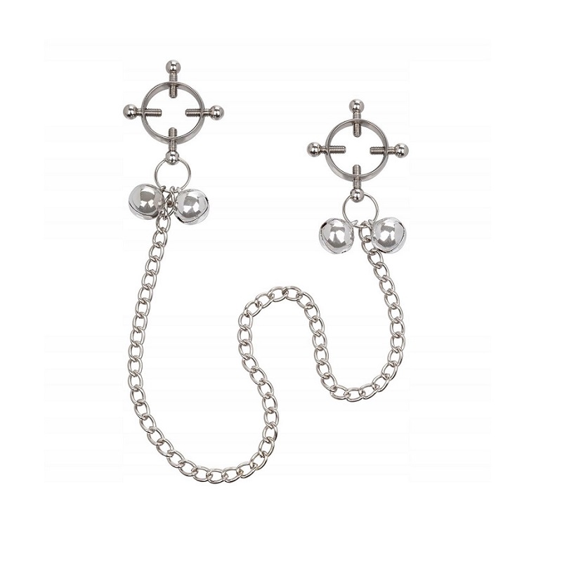 Konstrukcja z czterema śrubami pozwala na precyzyjne dopasowanie nacisku – możesz regulować docisk tak, aby idealnie odpowiadał Twoim preferencjom. Połączone łańcuszkiem klamry dają dodatkową możliwość pociągnięcia, co wzmacnia doznania i dodaje pikantnego napięcia. Delikatne dzwoneczki umieszczone na końcach nie tylko pięknie brzmią, ale też podkreślają zmysłowy charakter zabawy.