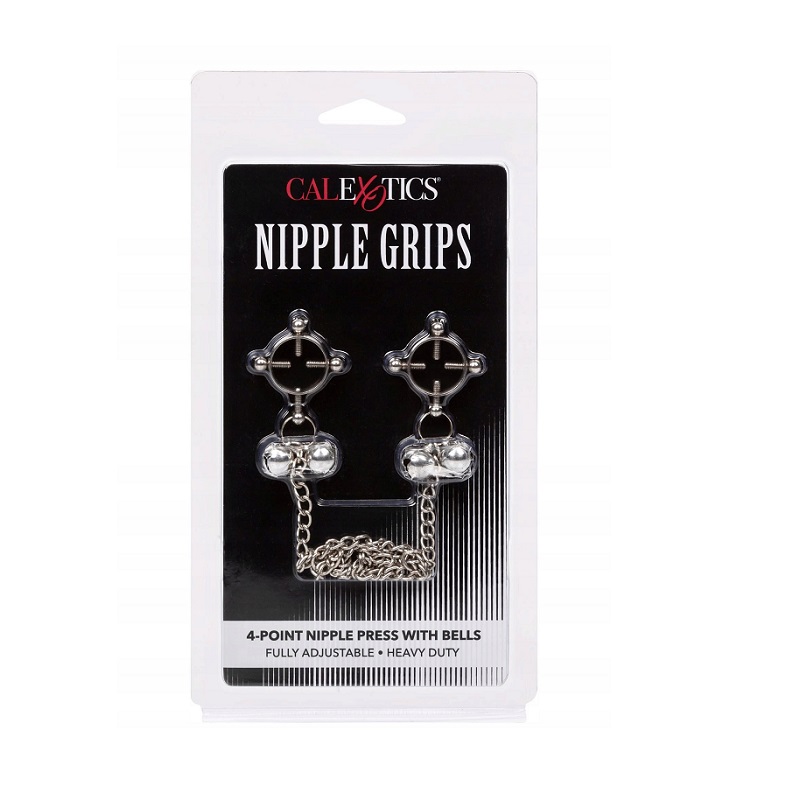 Metalowe klamry na sutki z regulacją nacisku i dzwoneczkami. Nipple Grips 4-Point Press zapewnią intensywną stymulację i zmysłową zabawę.